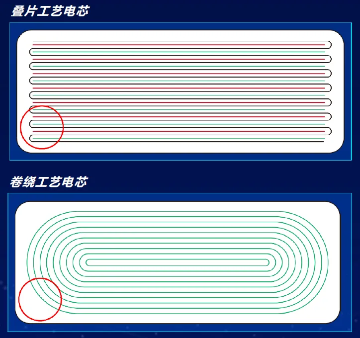 与众多厂商不同的是,欧博体育app从20年前便选择了锂电叠片工艺,而不是常规的卷绕工艺,就是基于对电池安全性和循环寿命的考量。叠片工艺相较卷绕工艺实现了更高的能量密度,同时极片膨胀收缩时保持平整,内部应力分布均匀,不存在弧形拐角处的应力集中问题,使用更安全。